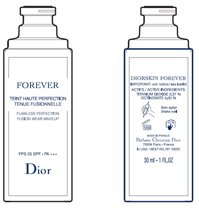 FOREVER TEINT HAUTE PERFECTION TENUE FUSIONNELLE FLAWLESS PROTECTION FUSION WEAR MAKEUP FPS 25 SPF - PA +++ Dior DIORSKIN FOREVER IMPORTANT: see leaflet ACTIVE INGREDIENTS: TITANIUM DIOXIDE 2.37 % OCTINOXATE 4.00 % Shake well 12 M MADE IN FRANCE Parfums Christian Dior 75008 Paris - France In USA: 19E57 NY. NY 10022 30 ml - 1 FL.OZ